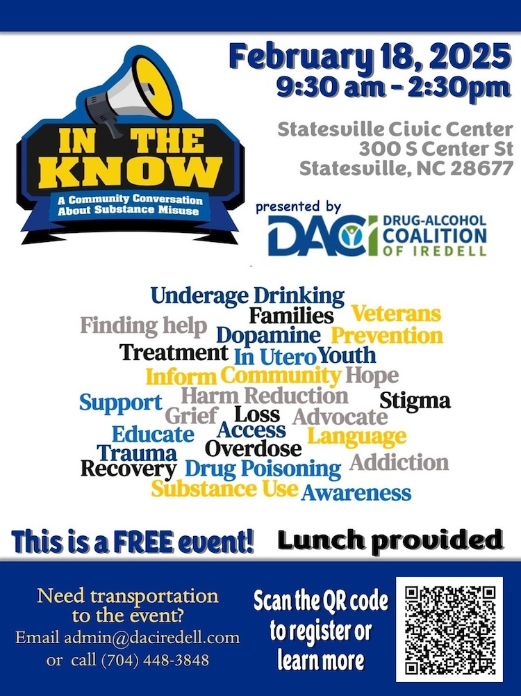 DACI and MGSD invite you to join the conversation! MGSD is fortunate to have excellent partners throughout Iredell County. The Drug-Alcohol Coalition of Iredell (DACI) is one of our partners and they will be holding a community event: In the Know - A Community Conversation About Substance Misuse.